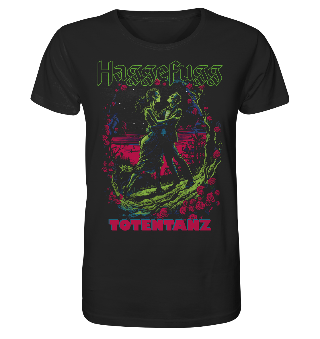 Totentanz - das ausgefallene Motiv-Shirt zum passenden Song des neuen Haggefugg Albums "Tanz und Gloria". Schwing deine müden Knochen! Hochwertige Qualität, aus biologischer und fairer Herstellung. Mit PETA-Zertifizierung für tierfreundliche Produktion. Zeige deine Leidenschaft zur Musik und kleide dich nachhaltig!